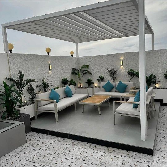 تشمل أرائك مريحة، طاولات خارجية، ومظلات للحماية من الشمس.